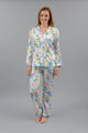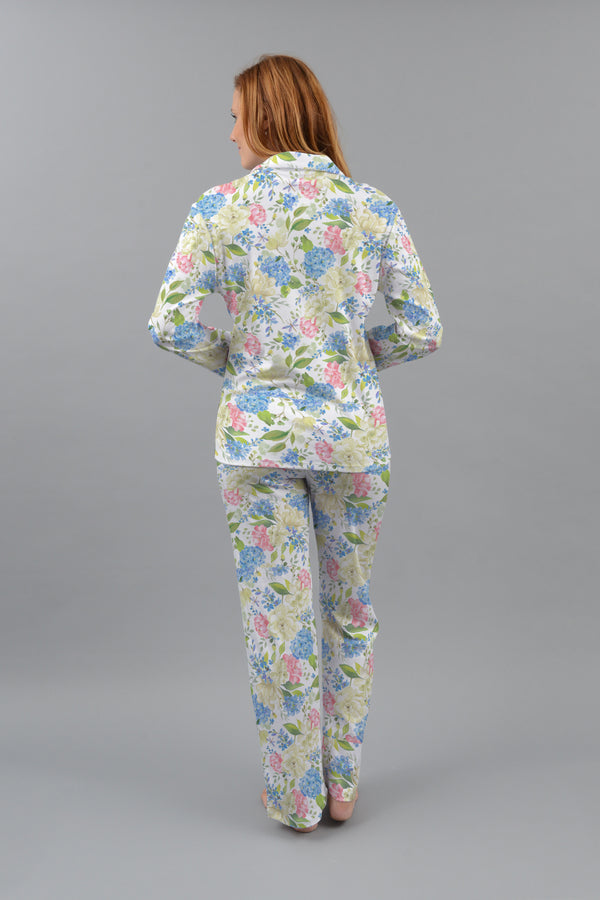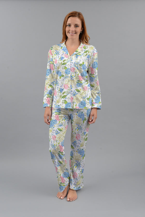 The classic long sleeve long pant gardenia pj is a must have for the classic collector. The beautiful print is soft and flows well. The top has long sleeves and a button front closure. the pants have an elastic waist and draw string. Available in extra small through extra large. It is a full cut which provides comfort.