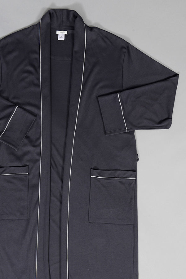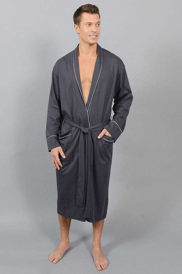 What man wouldn't love a new robe? We have a brand new collection of items for men, including this beautifully tailored shawl collar robe. Get ready to cozy up to your guy's signature 100% Pima Cotton robe that features, a loose belt, 2 inseam pockets and a mid calf length. Available in heather grey with ink piping, or ink with heather grey piping, and 2 roomy sizes S/M or L/XL.