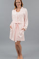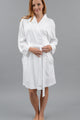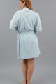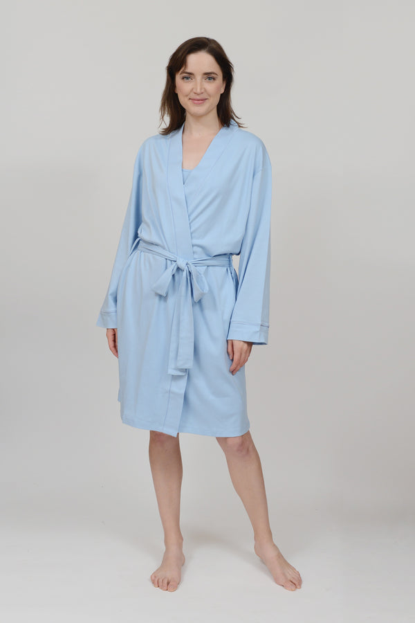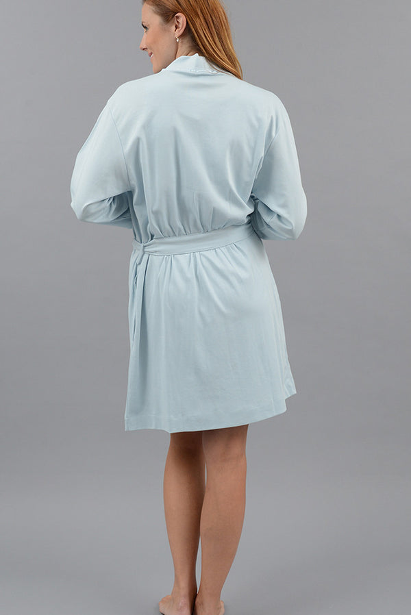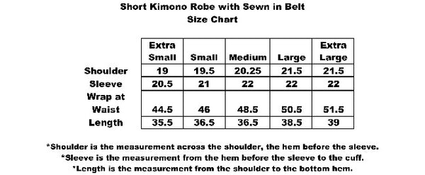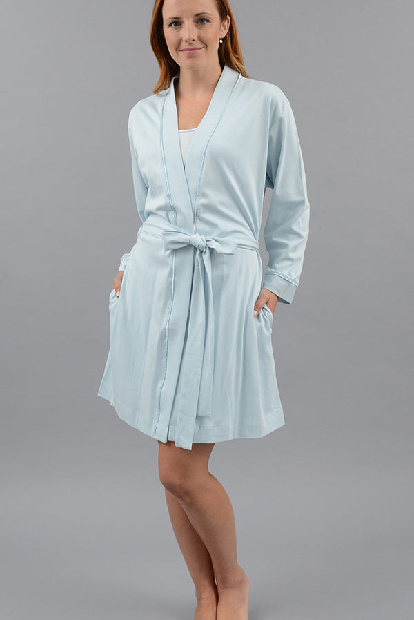 Our classic short kimono robe is an all time favorite! We have sewn the belt into the waist band at the back of the garment, for ease of use and a comfortable fit against the lower back. 100% Premium Pima Cotton with 2 inseam pockets and beautiful satin piping for a gorgeous finish.
