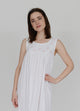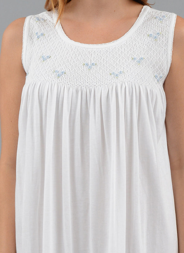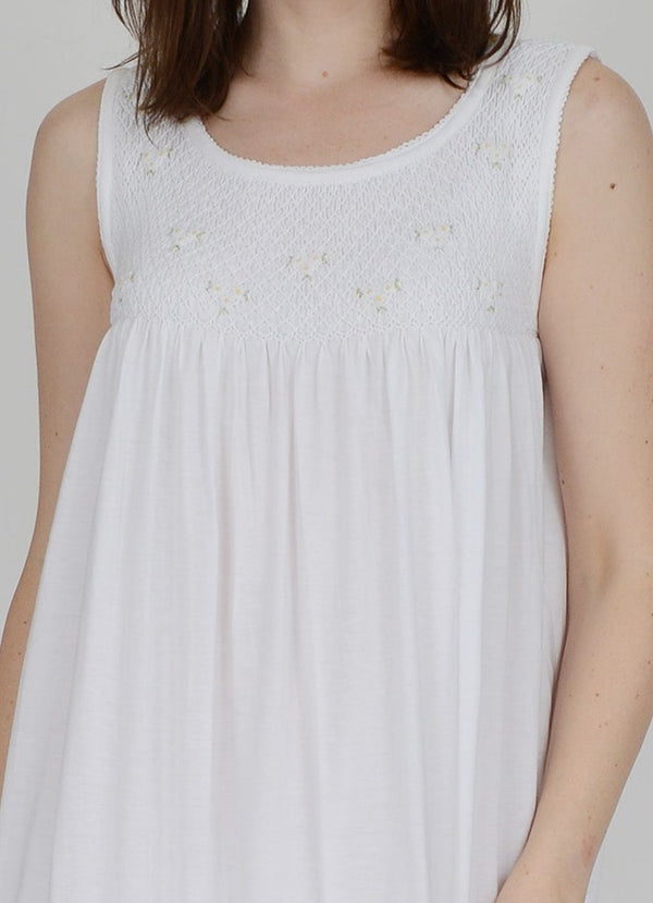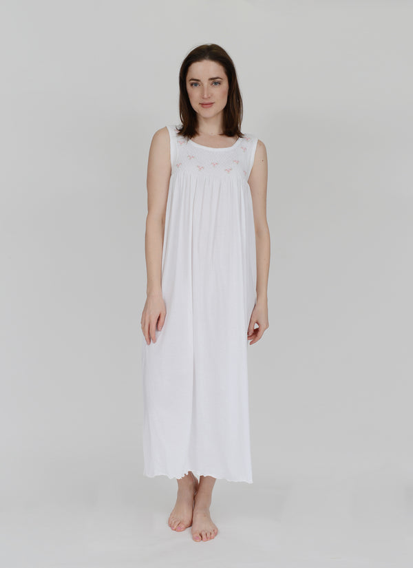 The Smocked Collection Nightgowns are the most delicate and feminine of nightgowns. Butter soft lightweight white Pima cotton jersey, with a beautiful hand smocked bodice and tiny clusters of embroidered flowers. This tank style gown is 48" long.