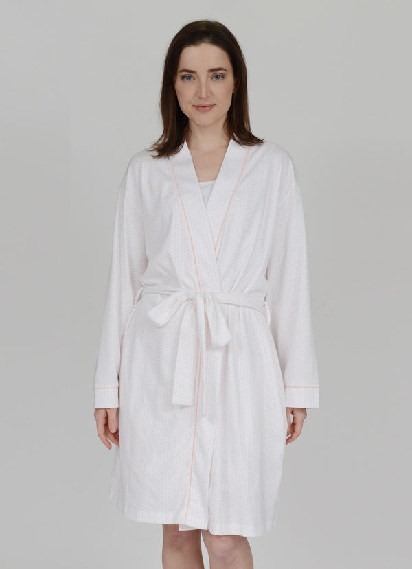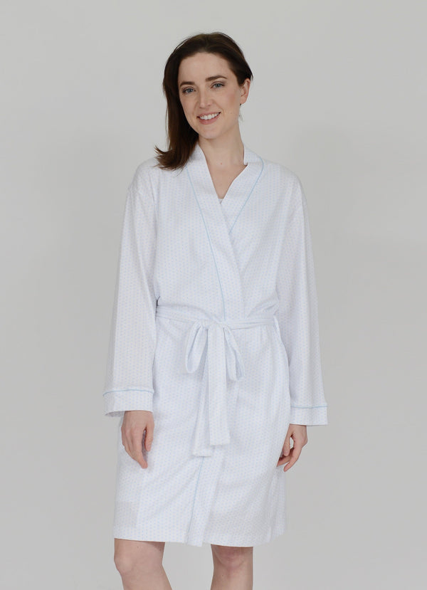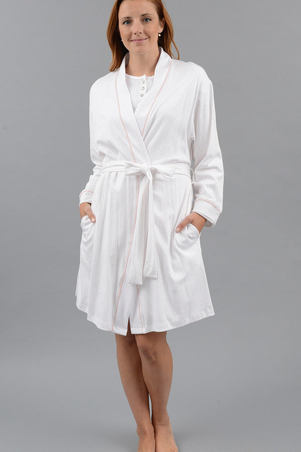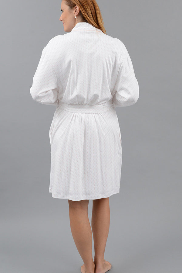 Our favorite short kimono style robe with a set-in belt now offered in white with a cute pink mini dot print, and matching satin piping. This robe features 2 inseam pockets, and inside ties. You'll love it for home or travel, as it is light enough to pack. Now available in Blue, Pink, Grey, Periwinkle and Denim Dots.